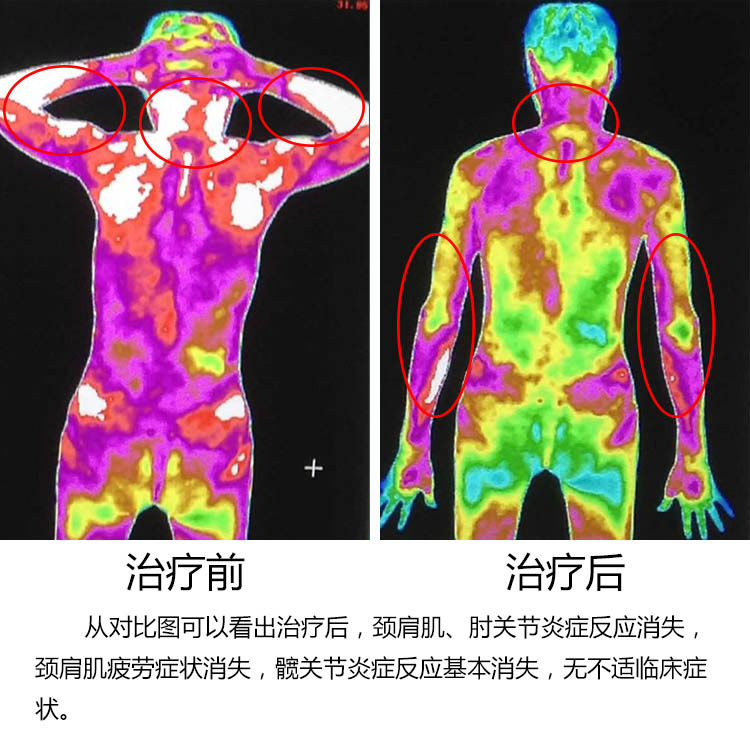 检查原理:一般来说,正常人的骨骼、关节温度均匀,与肌肉血管区的温度相比,温度稍低。如果不受外界干扰,平均温差在0.2℃-0.3℃。如果骨骼、关节出现无菌性炎症后,局部温度增高,炎症活跃及炎性增生的骨骼、关节骨质会影响周围血循及局部微环境,温度会增高0.4℃-1.5℃。此时,采用医用红外热成像仪检测,通过热像仪镜头,可以精准、清晰的接收人体发出的远红外线,得到人体各部位组织、骨骼、关节、脊柱等详细温度变化数据信息,这些数据由计算机3D处理后成为一幅人体的红外热图,根据红外热图的不同颜色及数据指标,可清晰看到无菌性炎症的分布、范围、程度等,为彻底祛炎提供科学的数据。